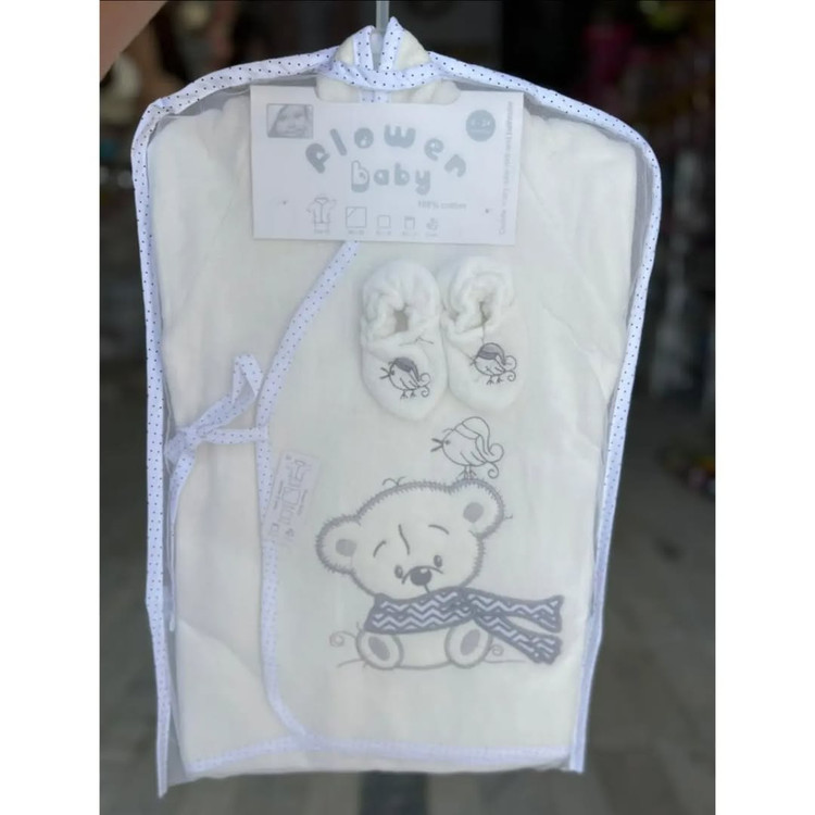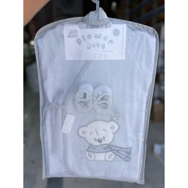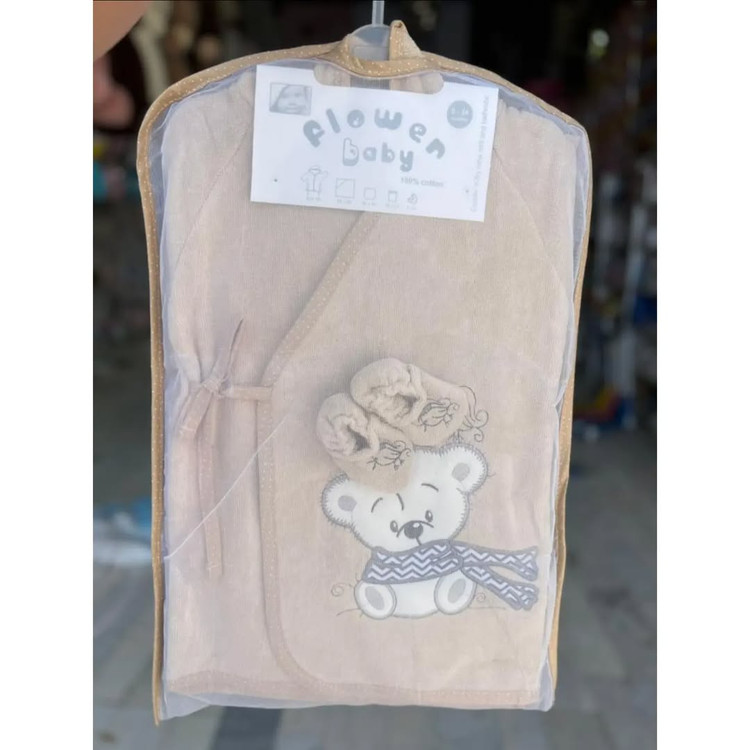 شامل حوله کلاه دار مناسب تا یک سال،حوله تن پوش مناسب از ۱ تا۳سال ، حوله صورت ، لیف، پاپوش حمام
